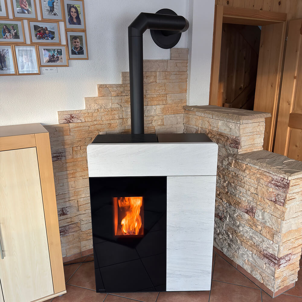 Während des Beratungsgesprächs in den Ofen Welten Küblis entschied sich unser Kunde für den Rika Domo Multiair Pelletofen. Mit einer Heizleistung von 3–10 kW überzeugt dieses Modell durch seine starke Performance und flexible Einsatzmöglichkeiten. Zudem verfügt dieser Ofen über einen Pellettank von 51 kg. Und der Verbrauch ist dank patentiertem Verbrennungssystem auch bei Voll-Last eher minim gehalten.